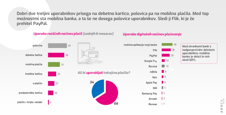 Poleg mobilne banke je za plačevanje najbolj razširjen Flik, tretjina je uporabnikov PayPala, ostali digitalni načini plačevanja pa imajo bistveno manjše deleže uporabnikov – mobilno denarnico Google Pay na 4. mestu uporablja le dobra desetina. Več kot desetino uporabnikov ima tudi tuja banka Revolut, ki omogoča plačevanje preko mobilne denarnice.